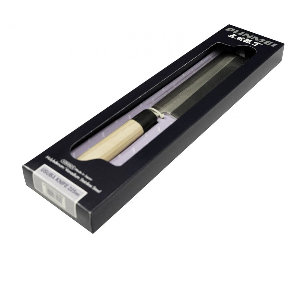 Bunmei knives are the favourite of many Japanese cooks. They are made in the traditional Japanese style, and have a typical Japanese look and feel. Made with a slip-resistant bamboo handle and traditional one-sided blade grinding for a razor-sharp edge to enhance food freshness. Ideal for raw fish or meat, these Bunmei knives are perfect for any style of Sushi or Sashimi cooking. Made by Yoshikin, the manufacturer of Global knives, these Bunmei knives use the very latest production methods and high tech molybdenum / vanadium stainless steel in their construction.