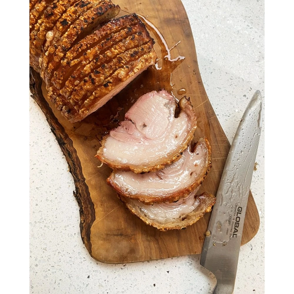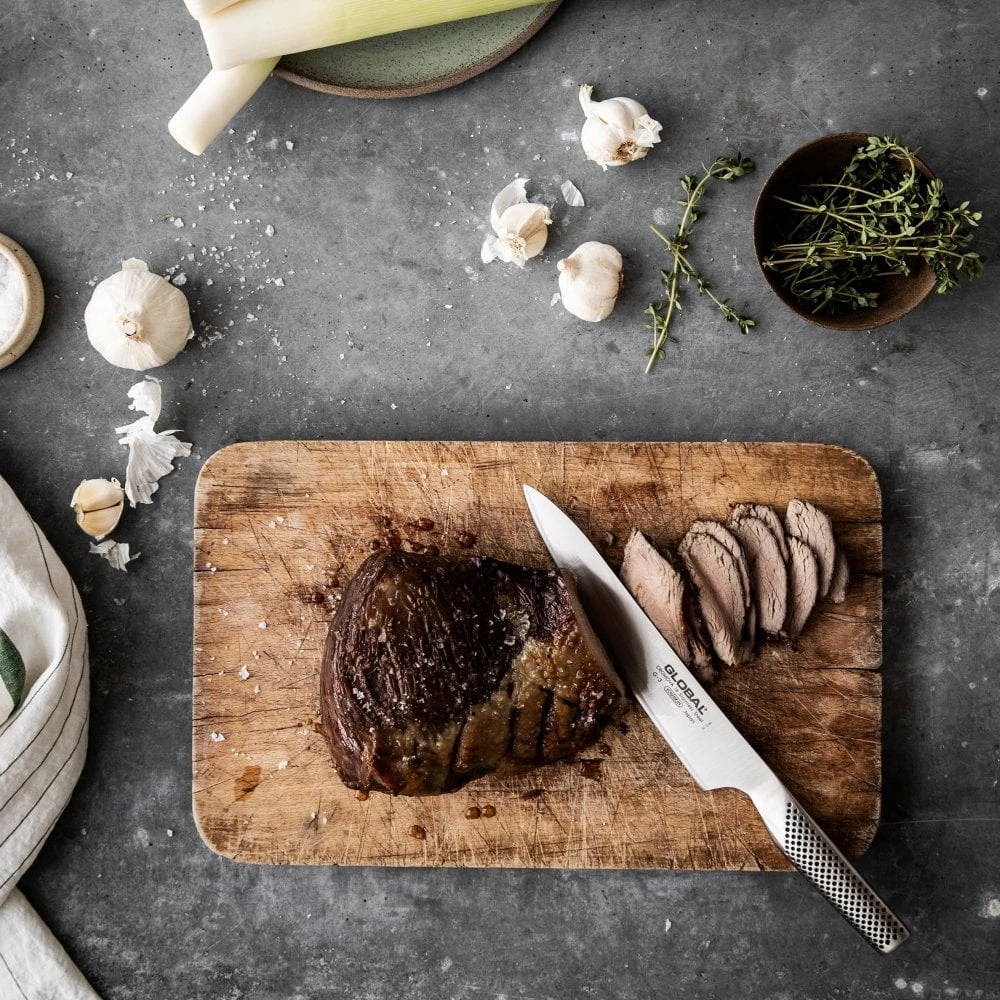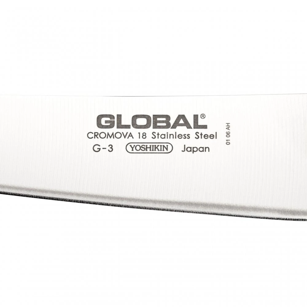 The G-3 is Global’s classic carving knife, long and narrow to carve those perfect Sunday beef joints. There is only one G series carving knife and it is a specialist knife that is not well suited to other tasks, but that should not really matter, because the best cuts of meat demand the best equipment. Having a super sharp Global carving knife will ensure all your cuts of meat are thin and tender. We recommend pairing the G-3 with one of Global’s carving forks, either the G-13 or the GF-24 to make a matching set. The G-82 is the fluted version of this knife.