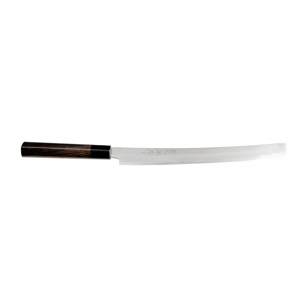 After graduating from the Department of Electrical Engineering in Takefu Technical High School in 1967, Masanobu started working in the knife industry with his father, Monjiro II . Originally a blacksmith of gardening tools, Masanobu Okada specialises in making unique kitchen knives. Here we present a knife that he makes for fun, the Takobiki knife, which is a variation of the Japanese sashimi knife used to prepare Sashimi.