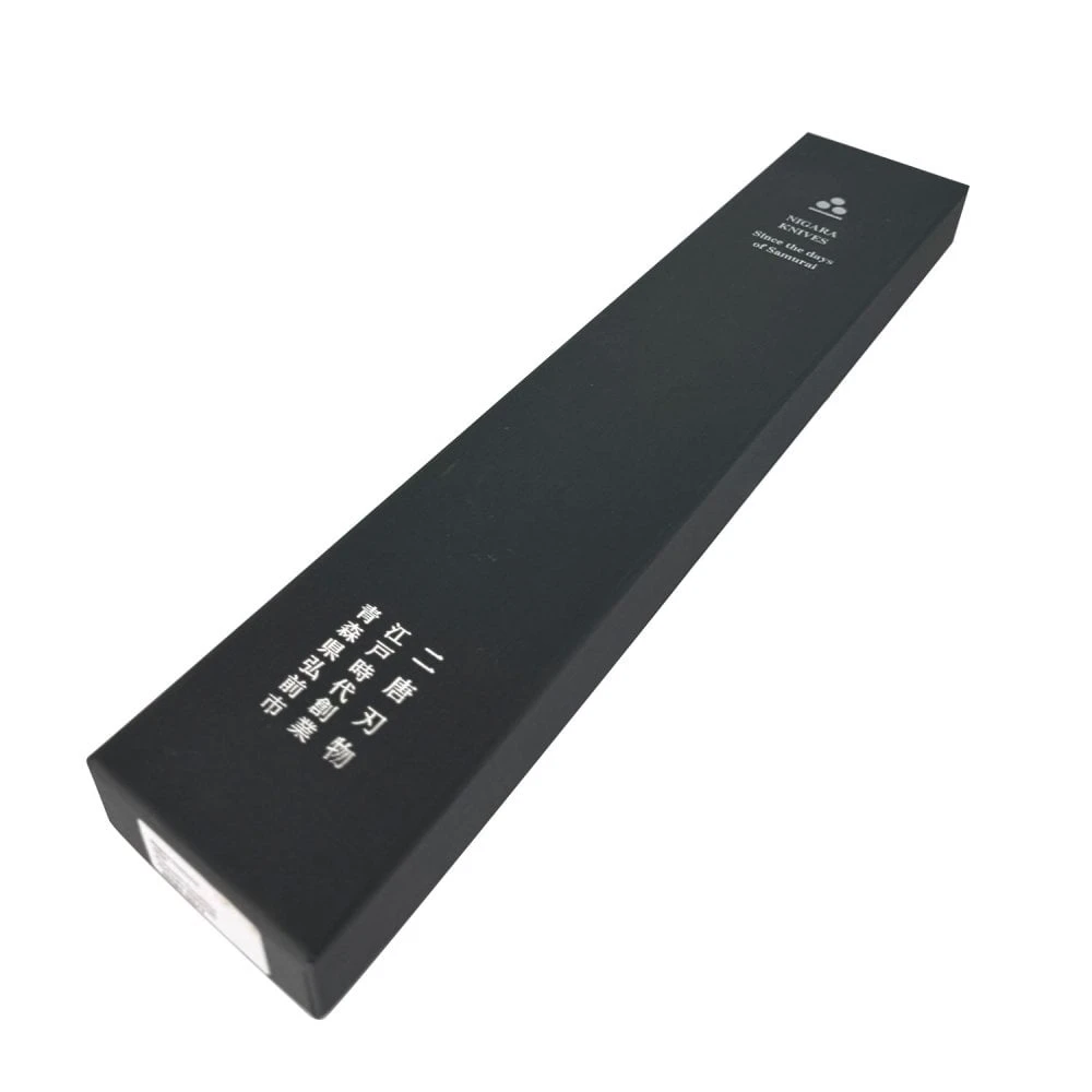 Presented in a beautiful grey presentation box, the Nigara Hamono knives are showcased with elegance. The brand’s logo, delicately embroidered in silver foil, adds a touch of sophistication to the overall presentation. This attention to detail reflects the pride and craftsmanship inherent in every piece they create.