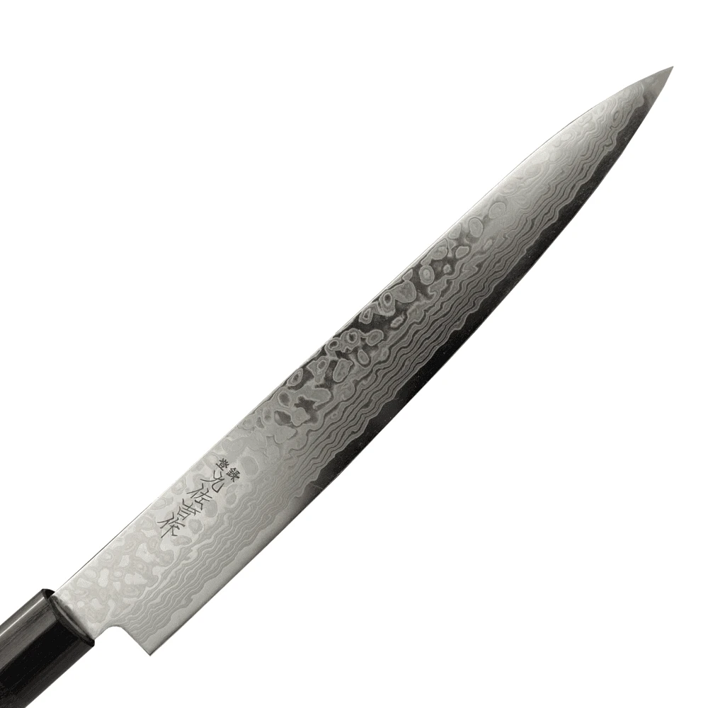 To start with the ZA-18 steel is user friendly and has rust-resistant properties that make it easy to care for. The Alloy composition of ZA-18 is made up of cobalt, molybdenum, chromium with a carbon content that is slightly higher than the level found in VG-10, giving the blade a higher resistance to corrosion and a touch more strength and durability. VG-10 being the steel of choice for most of the blacksmiths that make up the Takefu Knife Village. The steel is tempered to give a hardness of around 61-62HRC. ZA-18 Damascus Sujihiki is a superb, versatile kitchen knife with a great balance, incredible sharpness, resistance to rust, easy to maintain and to sharpen, with a beautiful 69-layered Damascus patterning. The handles are a beautiful Rosewood D-Shape. The ZA-18 Damascus Sujihiki is made by the leading blacksmith of Yoshida Hamono, Osamu-San. The blades are decorated with 69 layers of Damascus patterning. A fantastic knife for working with fish, but can also be used as a carving knife.